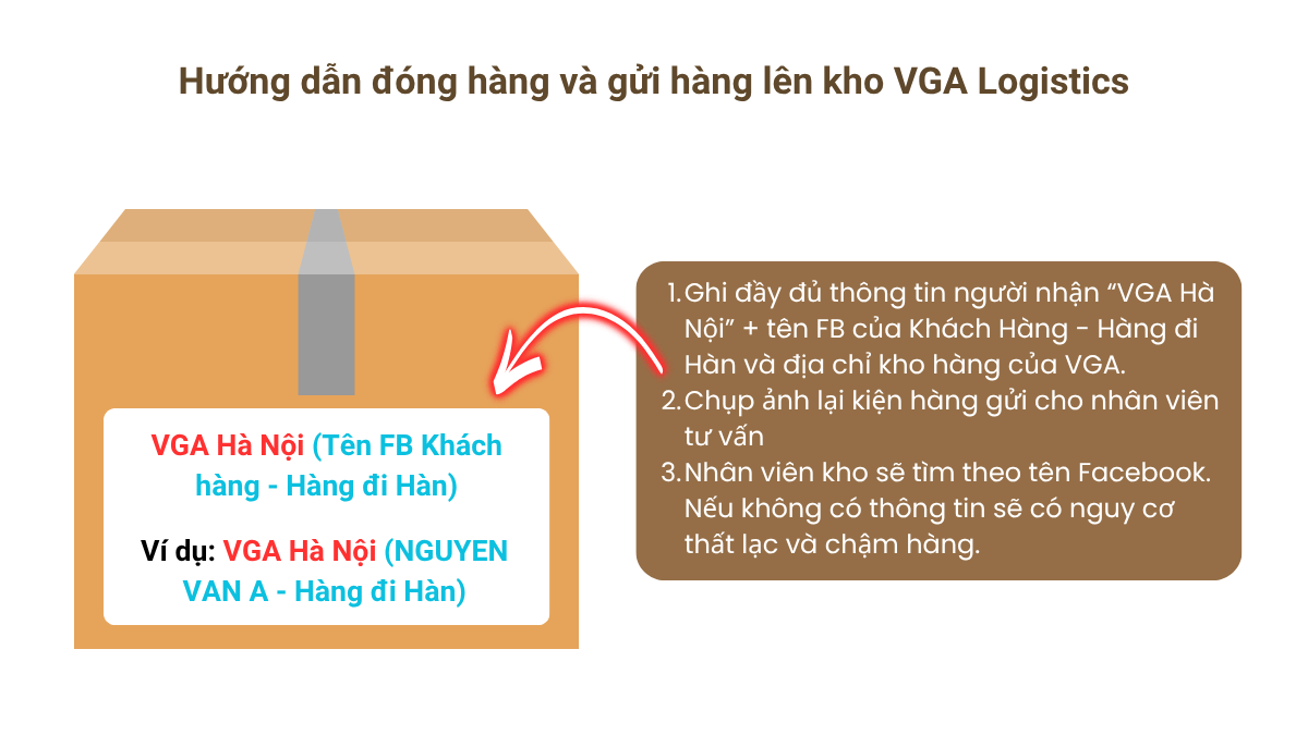 VGA Hà Nội (NGUYEN VAN A – Hàng đi Hàn). Nhận tại kho sẽ tìm theo tên Facebook. Nếu không có thông tin sẽ có nguy cơ thất lạc và chậm hàng.